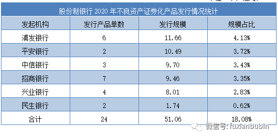 2020年股份制銀行資產(chǎn)承壓,不良資產(chǎn)化解需求較大,因此不良資產(chǎn)證券化發(fā)行產(chǎn)品較多。其中以浦發(fā)銀行發(fā)行產(chǎn)品單數(shù)最多,規(guī)模最大。而民生銀行發(fā)行發(fā)行規(guī)模最小。整體而言,股份制銀行不良資產(chǎn)證券化產(chǎn)品發(fā)行規(guī)模處于第二梯隊: