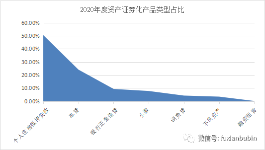 2020年度,信貸資產(chǎn)證券化產(chǎn)品一共發(fā)行184單,規(guī)模共計8041.90億元,其中,以個人住房抵押貸款、車貸、銀行正常信貸、小微、消費(fèi)貸、融資租賃為底層資產(chǎn)的資產(chǎn)證券化產(chǎn)品占比分別為50.49%、24.13%、9.38%、7.80%、4.31%、0.19%,同比都有不同幅度的縮減,但不良資產(chǎn)證券化產(chǎn)品的市場份額則從1.49%提升至3.50%,在疫情影響下呈現(xiàn)大幅逆勢增長。