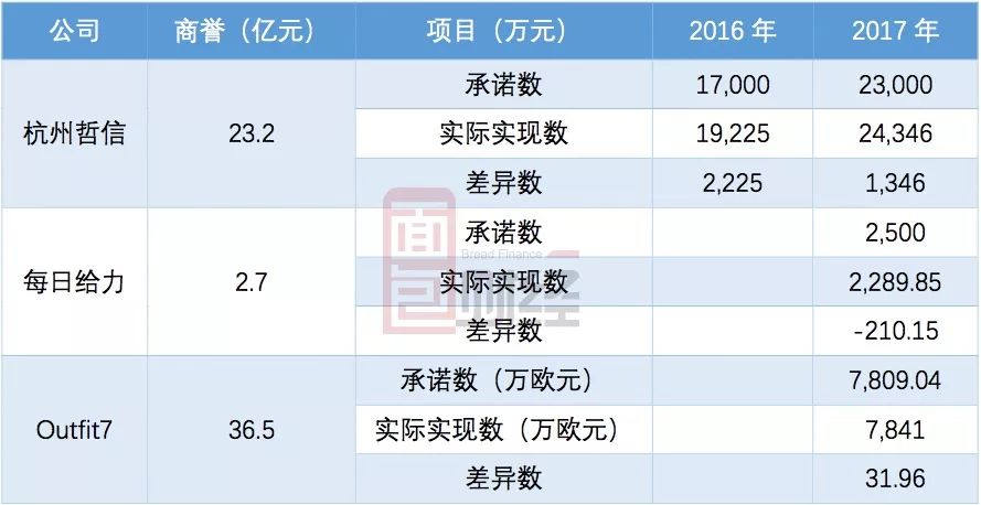此外,形成商譽(yù)最大的Outfit7,2017年業(yè)績也是壓線完成。Outfit7公司2017年度實(shí)現(xiàn)扣非后歸母凈利潤7841萬歐元,僅超過承諾數(shù)31.96萬歐元。以下為根據(jù)公開數(shù)據(jù)統(tǒng)計的主要幾家子公司業(yè)績完成情況:
