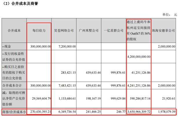 其中,通過上虞碼牛和杭州逗寶間接持有Outfit7的56%的股權(quán)收購價高達(dá)42.41億元,合并形成商譽(yù)約36.5億。