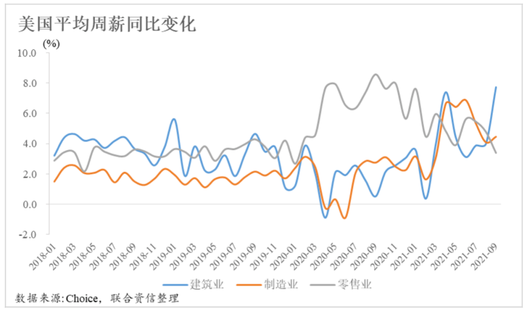 4.勞動力短缺導致用工成本大幅增加,行業平均周薪自2020年中起持續走高,進一步推升企業生產成本,并導致部分企業將成本向消費者轉移。