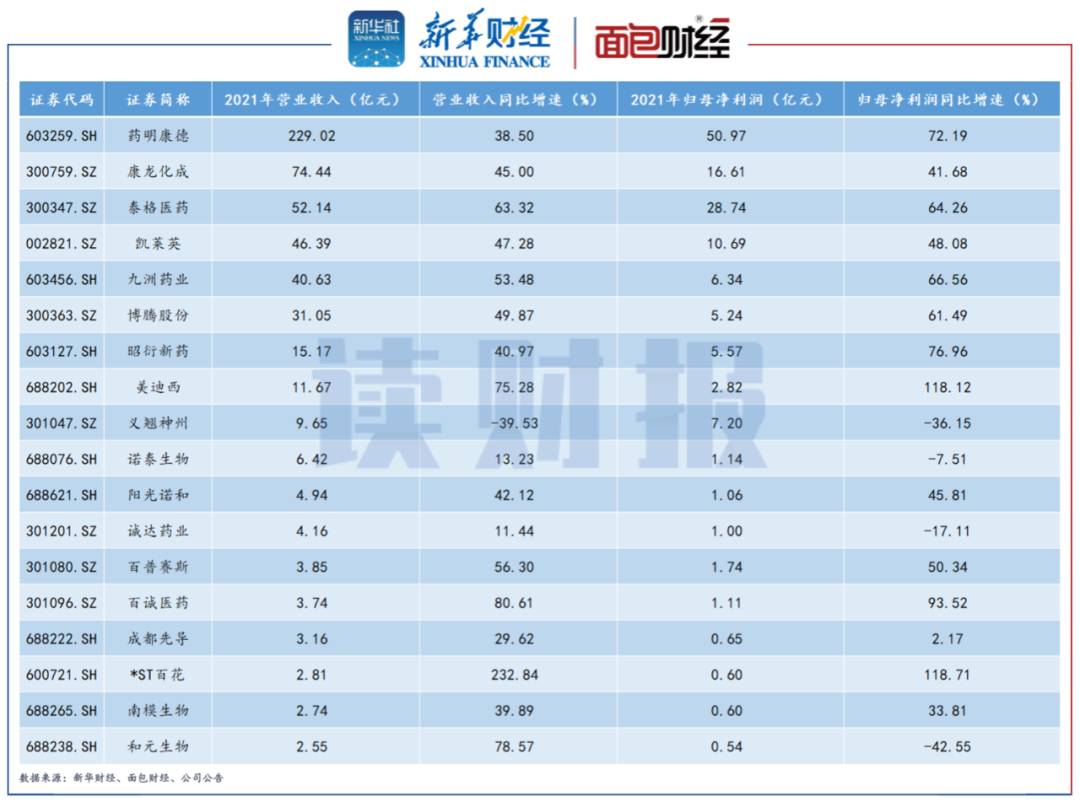 根據申萬醫療研發外包行業分類,截至2022年4月24日,板塊內21家滬深兩市上市公司中已有18家披露2021年年報或業績快報。