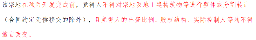 (2)對競拍主體競得土地后的股權變更限制越來越多,比如需穿透到上面第三層級的股東,甚至不允許競得主體的實控人發生變更。例(某市集中拿地掛牌公告中關于競得主體不得變更的要求):