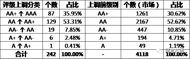 可以看出,242個評級上調中,從AA上調到AA+的占比最多,高達53.31%,其次是從AA+上調至AAA的,占比35.95%。該結構與全市場中AA及AA+在[A、A+、AA-、AA、AA+]5個級別中的占比類似。也就是說,今年主體評級的上調是全市場整體的上移,對于各級別而言,差異不大。當然,最終導致市場中AA+及AAA等高級別占比越發集中了,評級泡沫化越發嚴重。