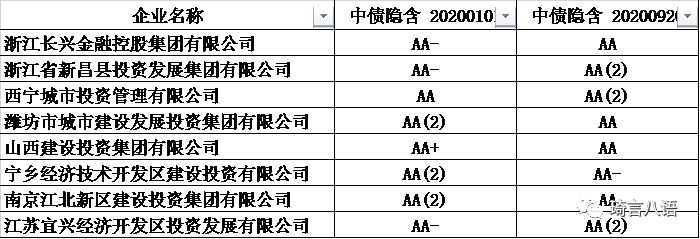 首先,查詢上述221個主體在2020年1月1日與9月20日的中債隱含評級結果,可以看出僅8個主體有評級變化,且3家主體(西寧城市投資管理有限公司、山西建設投資集團有限公司、寧鄉經濟技術開發區建設投資有限公司)的評級結果也是下調的: