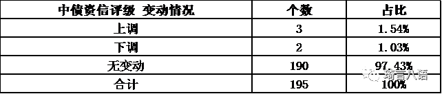 最后,查詢以上221個主體在2020年1月1日與9月20日的中債資信評級結果,發現兩個時點都有評級結果的195個主體中,僅有5家的主體評級所有變動,其中3家上調評級,2家下調評級: