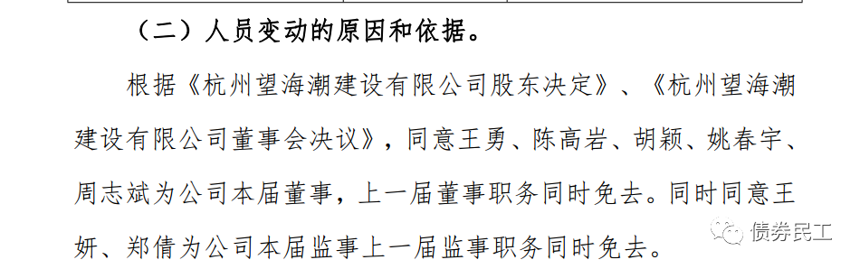 4、2022年1月7日,杭州望海潮建設有限公司公告稱,公司上一屆的全部董事和全部監事同時發生變動。