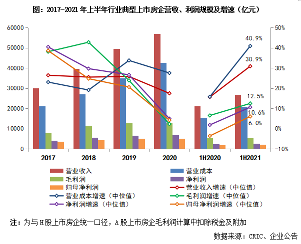 具體來看,2021年上半年行業(yè)80家典型上市房企1整體實(shí)現(xiàn)營收收入26839億元、營業(yè)成本21039億元,營收和營業(yè)成本的增速中位值分別為30.9%和40.9%。雖然從數(shù)值上看,營收增幅較去年同期有明顯回升且處在歷年較高水平,但這主要是因?yàn)?020年上半年受疫情影響,項(xiàng)目竣工及交付結(jié)轉(zhuǎn)普遍延遲、收入無法如期確認(rèn)、上半年整體結(jié)算基數(shù)較低。