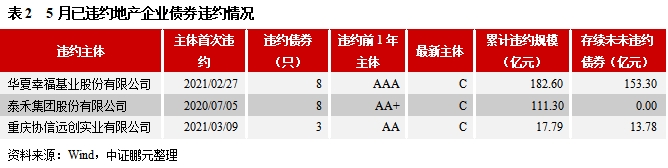 2021年5月,已違約主體泰禾集團股份有限公司(簡稱“泰禾集團”)、華夏幸福基業股份有限公司(簡稱“華夏幸福”)和重慶協信遠創實業有限公司(簡稱“重慶協信”)的存續債券繼續出現違約。截至2021年5月末,華夏幸福尚有存續債券153.30億元,其中有33億元在2021年面臨到期或回售;重慶協信尚有存續債券13.78億元,在7月和9月到期;泰禾集團所有發行債券均已到期或違約。