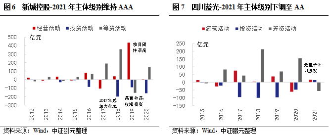 對比尚未違約的企業,新城投資的項目周轉率高,經營獲現能力較高,除在加大拿地的年份出現經營性現金流收縮外,均能維持正數。而四川藍光,近年受項目建設支出和拿地節奏影響,公司經營性活動凈現金流呈現波動,債務規模出現增長,短期債務占比提升,且非銀融資規模較大。2021年級別出現下調,主要是因為再融資壓力較大,2021年面臨大規模債務的集中兌付,且土地儲備相對不足。