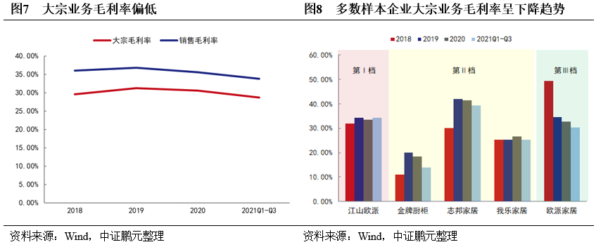 大宗業務“量大利薄”,其增速放緩對第I、II檔企業及中小規模企業影響較大,未來競爭加劇,其盈利空間將持續被壓縮。大宗業務經歷2018-2019年的快速增長,2020年受疫情、地產調控等影響增速放緩,2021年以來地產調控升級,房企資金壓力上升,雖然企業積極拓展同優質房企的合作,卻未能阻止大宗業務增速下滑。2021年三季度江山歐派、我樂家居的大宗業務分別同比下降24.11%和14.62%。