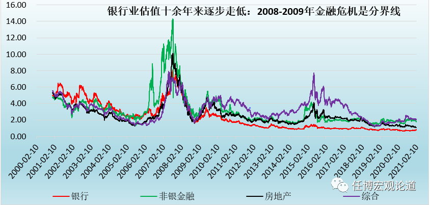 截至2021年2月10日,A股上市銀行、非銀金融、房地產業的市凈率分別為0.80、1.81和1.07,均略低于2.06的平均水平,上市銀行的估值水平基本處于絕對低位。但如果將2000年以來的數據拿過來進行對比會發現以下幾個特征: