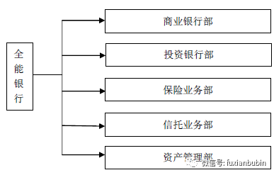 全能銀行是提供全方位金融服務的銀行,這些服務包括投資銀行業務、商業銀行業務和保險業務等。具體業務包括存貸款業務、金融工具、外匯及其衍生工具的交易、新債券和股票發行的承銷、經紀業務、投資管理業務和保險業務等。在全能銀行內部,各部門通過業務合作協調實現協同效應,采取企業內部化的方式實現交易成本最小化。