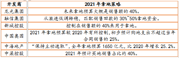 一是財(cái)務(wù)狀況好的開發(fā)商擁有更多資金和流動(dòng)性可用于購入最理想的地塊,2021年1~6月的拿地金額已明顯超過去年同期,并超過了此次40%的紅線。如招商蛇口、綠城中國(guó)、華潤(rùn)置地、金地集團(tuán)、龍光集團(tuán)、中梁控股等。