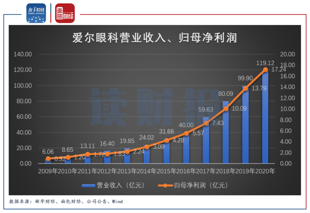 圖3:2009年至2020年愛爾眼科營業收入、歸母凈利潤