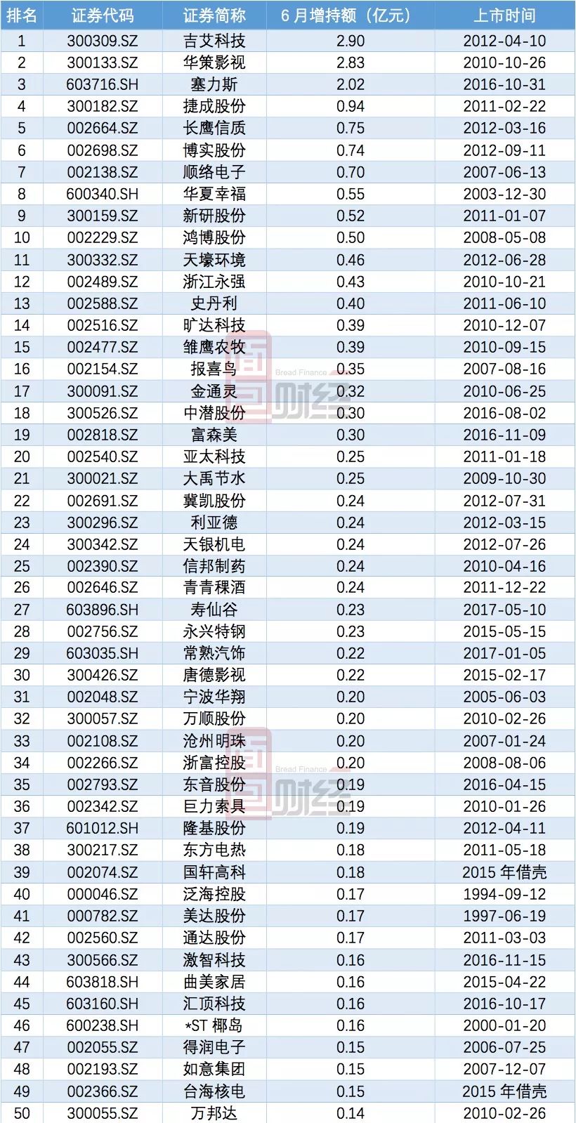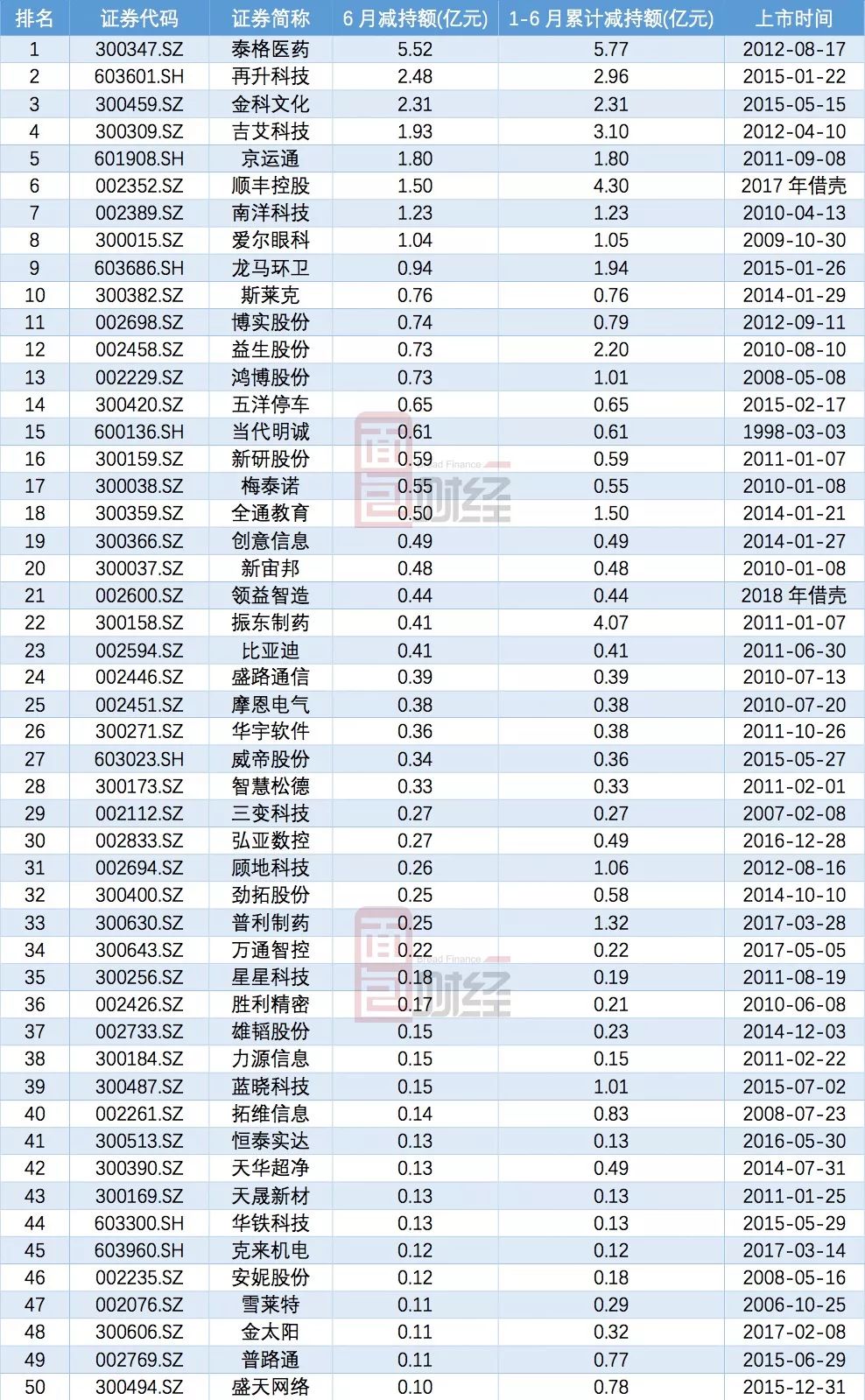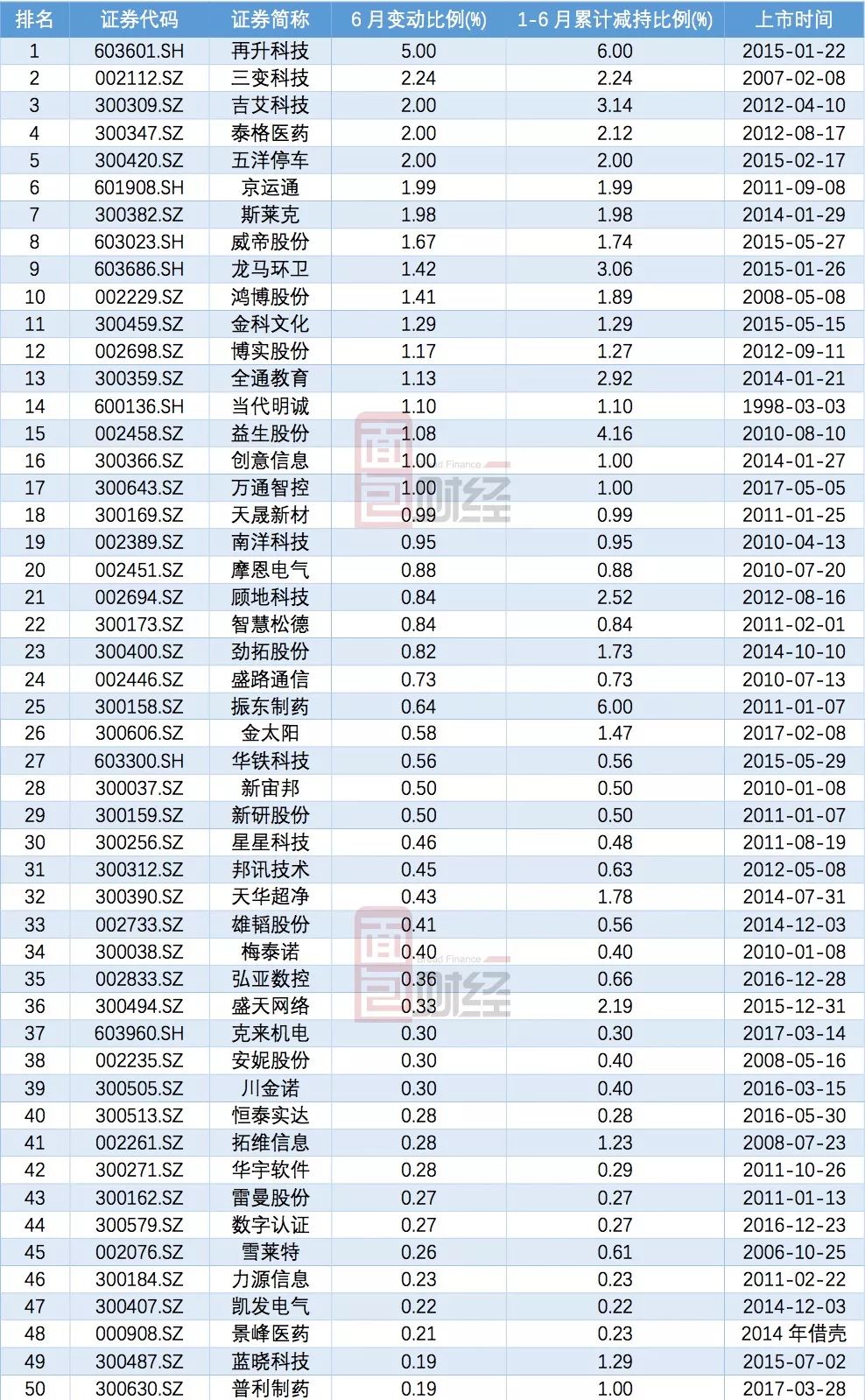 按2018年6月減持金額排行,排名前十的是泰格醫藥、再升科技、金科文化、吉艾科技、京運通、順豐控股、南洋科技、愛爾眼科、龍馬環衛、斯萊克。