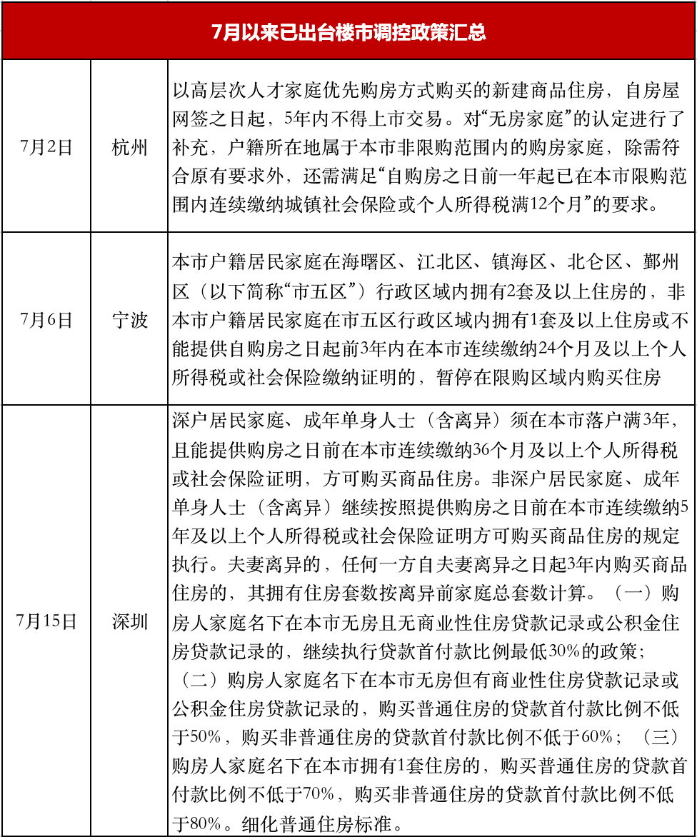 隨后,浙江臺(tái)州、麗水、海鹽等多個(gè)三四線城市發(fā)布樓市調(diào)控政策,掀起了新一輪三四線城市調(diào)控新周期。自7月熱點(diǎn)二線城市紛紛加碼調(diào)控至今,地方因城施策,調(diào)控正逐漸深入至三四線城市,未來(lái)調(diào)控大概率將繼續(xù)維穩(wěn),以更好地落實(shí)穩(wěn)地價(jià)、穩(wěn)房?jī)r(jià)、穩(wěn)預(yù)期的長(zhǎng)期目標(biāo)。