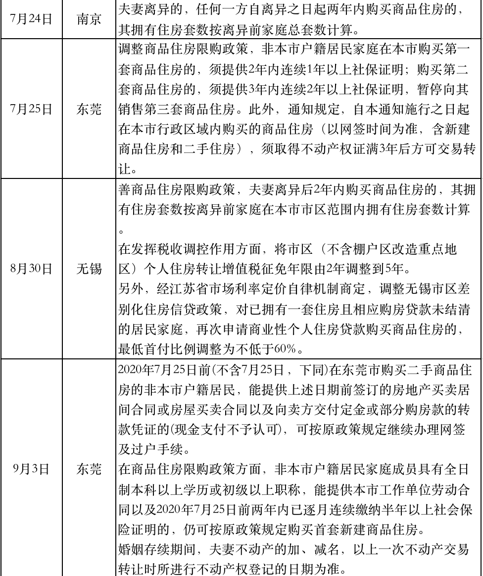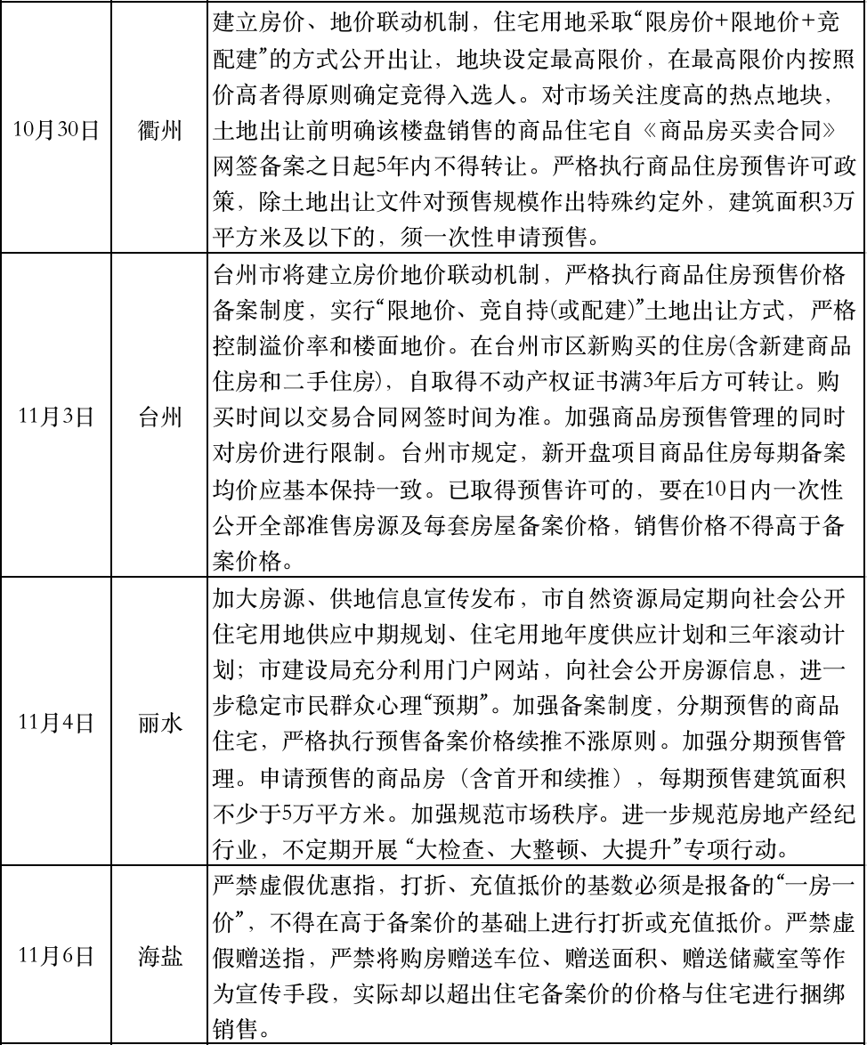 “十四五”規(guī)劃建議發(fā)布的同一天,浙江臺(tái)州升級(jí)了樓市調(diào)控,規(guī)定在臺(tái)州市區(qū)新購(gòu)買的住房(含新建商品住房和二手住房),自取得不動(dòng)產(chǎn)權(quán)證書滿3年后方可轉(zhuǎn)讓。麗水緊跟其后明確“四個(gè)加強(qiáng)”調(diào)控措施。