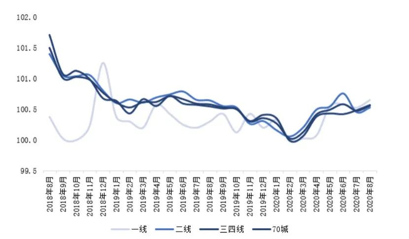 圖:2018年8月以來(lái)70城及各能級(jí)城市新建商品住宅價(jià)格指數(shù)環(huán)比走勢(shì)