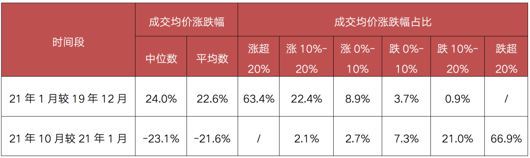 而在指導(dǎo)價(jià)出臺(tái)后,深圳二手房?jī)r(jià)格急速下跌。剔除零星成交的二手住宅小區(qū),深圳2021年10月二手住宅小區(qū)售價(jià)較2021年1月趨勢(shì)性下滑,可比價(jià)格跌幅中位數(shù)、平均數(shù)分別為-23.1%和-21.6%,二手房?jī)r(jià)格現(xiàn)已基本回歸到2019年底。其中,多達(dá)66.9%的二手房小區(qū)可比價(jià)格跌幅超20%,另有21%的二手房小區(qū)可比價(jià)格跌幅在10%-20%。