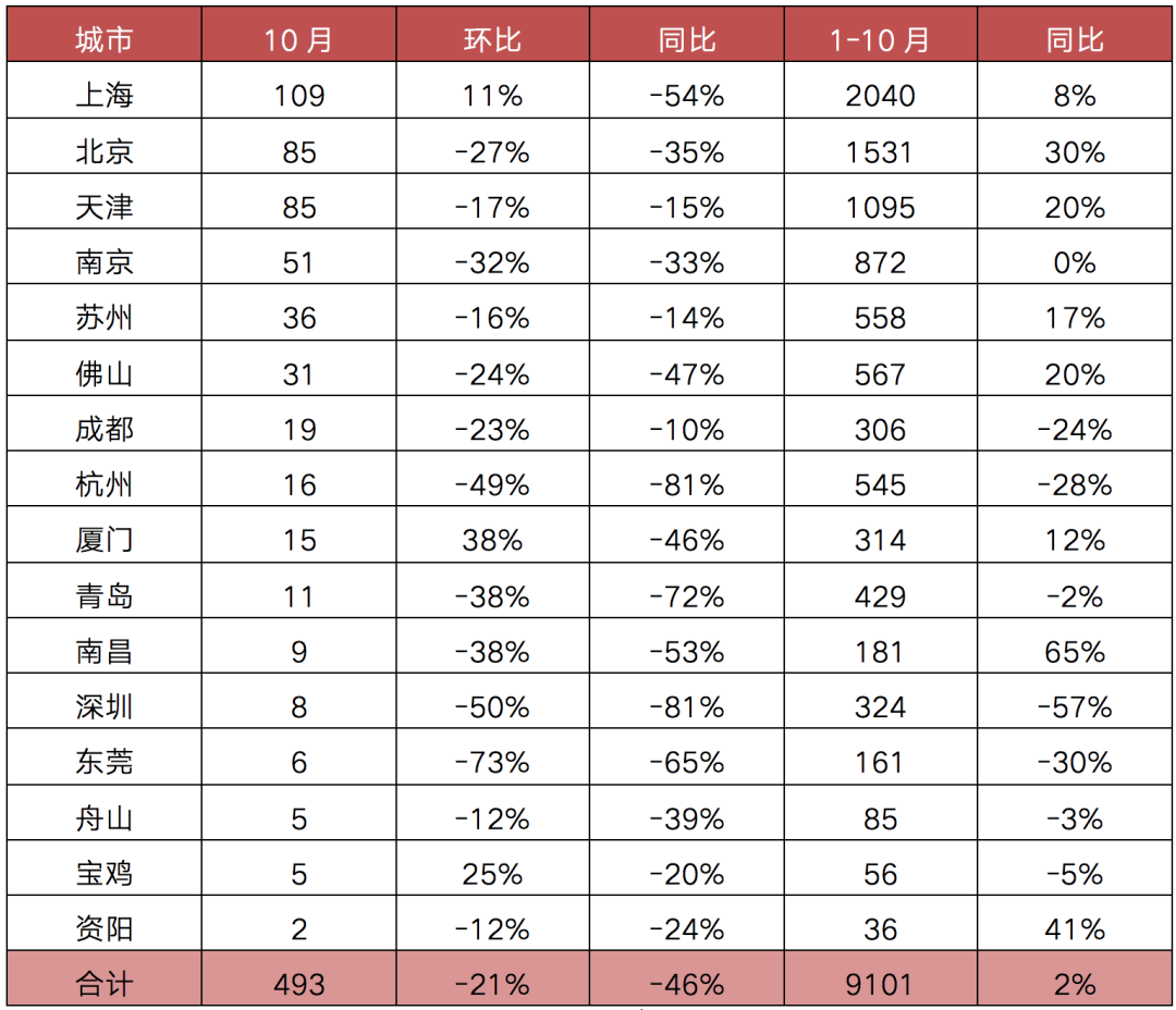 10月,二手房市場(chǎng)異常低迷,16個(gè)重點(diǎn)監(jiān)測(cè)城市成交面積493萬(wàn)平方米,環(huán)比再降21%,同比跌幅擴(kuò)至46%。其中,8成以上城市成交環(huán)比繼續(xù)下降,深圳、東莞更是創(chuàng)年內(nèi)新低,環(huán)比皆腰斬。各城市成交同比皆降,近4成城市同比腰斬,深圳、杭州同比跌幅更是超80%。