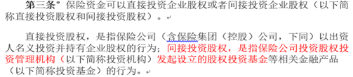 除了債權以外,保險資金還可以投資地產企業的股權,其中投資上市公司比較為人所知(比如人壽和大家保險投資遠洋集團、生命人壽投資金地、平安投資華夏幸福以及泰康投資陽光城等),而直接投資非上市地產企業的股權是被禁止的,當然這并不能禁止保險資金直接投資非房業務的股權。此外,其實還存在一種體量不小的重要投資方式,即間接投資股權的方式,如下(來自《保險資金投資股權暫行辦法》):