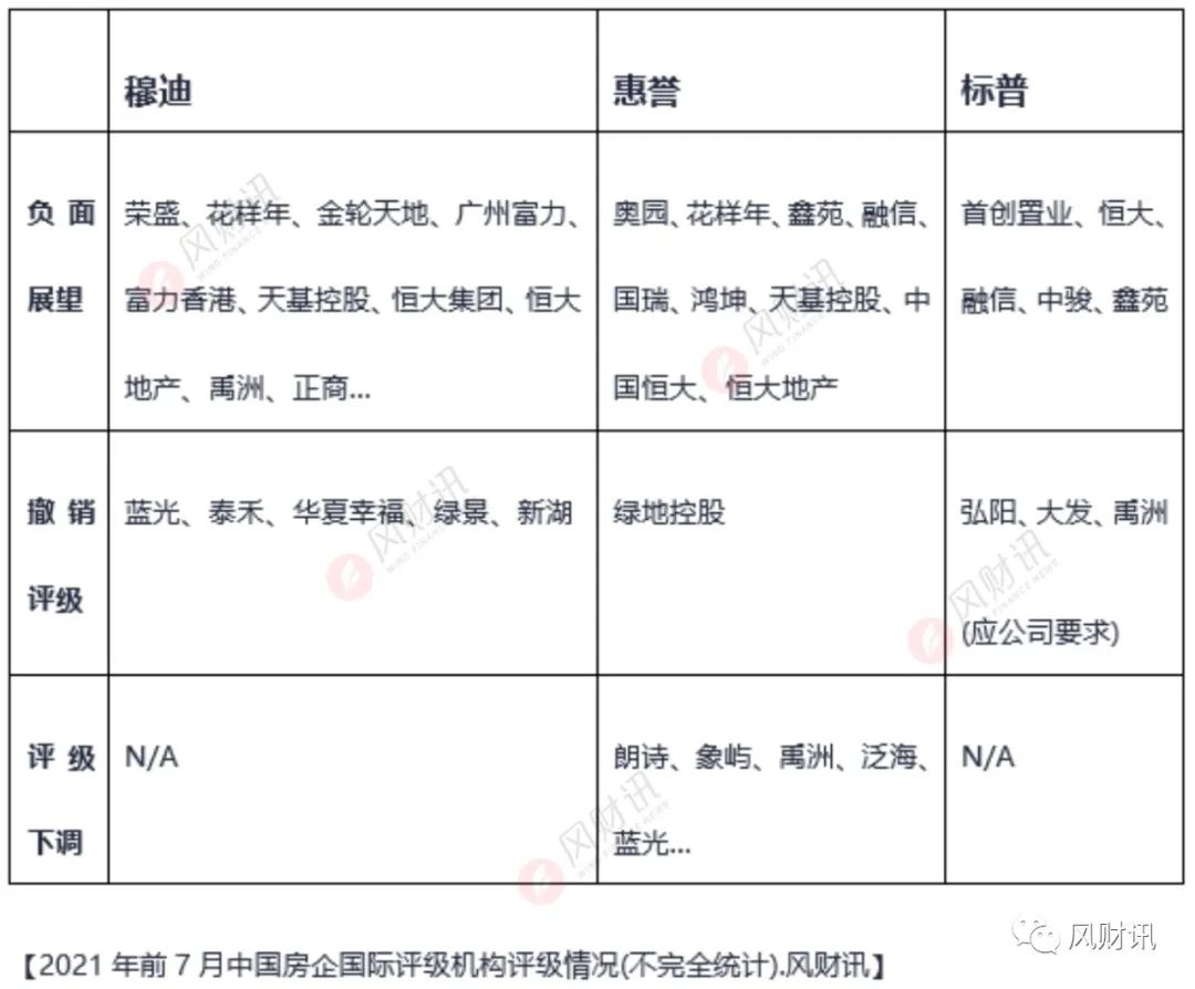 據風財訊統計,截止2021年7月底,穆迪Moody's對中國房企的評級,“展望負面”的已經超過10家,包括榮盛發展、廣州富力、禹洲、花樣年、富力香港、正商集團、金輪天地、天基控股、藍光發展等。