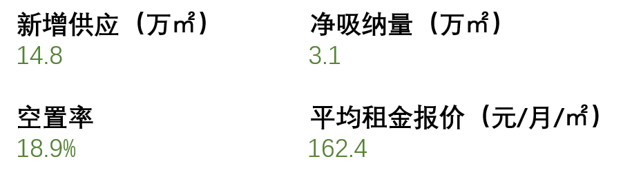 受互聯(lián)網(wǎng)頭部企業(yè)的收縮影響,季內(nèi)整體市場(chǎng)活躍度有所放緩,凈吸納量環(huán)比下降55%至3.1萬(wàn)平方米,空置率上調(diào)至18.9%。