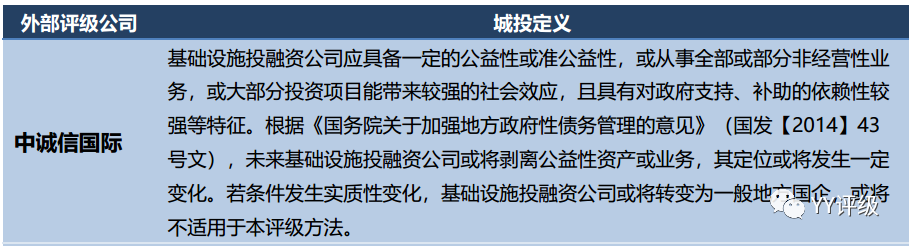 在考慮城投公司起源的基礎上各家評級公司也對各自定義了自己評級方法里的城投公司。基本上,中資評級公司對城投平臺的定義都是根據相關的政府文件來的,但是也有各家評級公司的自身的理解在里面,其中中誠信國際給城投公司命名為基礎設施投融資公司,突出了城投公司的職能;聯合資信和東方金誠細化了城市基礎設施投資的范圍;并且大部分評級公司都考慮了城投公司轉型的問題,強調如果城投公司的定位和業務范圍發生變化,將不適用于城投公司的評級方法。具體各家中資評級公司對城投公司的定義見下表: