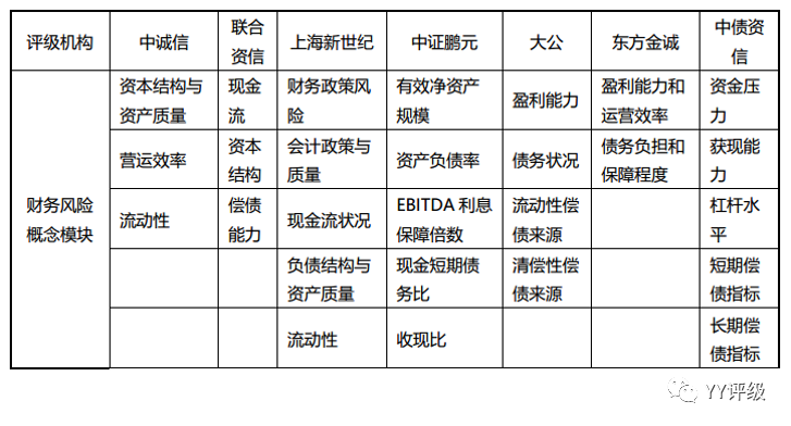 但是中誠信和大公國際以及中債資信的評級邏輯框架在此基礎上有所演化,其中中誠信在業務風險和財務風險外,將治理與管控單獨放在一個模塊中,主要從治理水平和管控能力兩個方面衡量。大公國際是將業務風險和財務風險重新調整為償債環境、財富創造能力、償債來源與負債平衡三個模塊。中債資信則是氛圍資源配置和債務政策兩個模塊。但是其實質僅是業務風險和財務風險中的內容重新分配的相應的個性化模塊中。