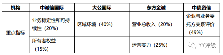 考察采用打分匯總法的評級機構的評級方法可以發現,上海新世紀的指標權重設置比較平均,沒有特別突出的關鍵性指標;大公國際設置的指標中區域環境相對較為重要;中誠信較為重視業務穩定性和可持續性以及所有者權益這兩個指標;中債資信認為企業與業務委托方關系評價較為重要;東方金誠認為營業總收入和運營實力較為重要。