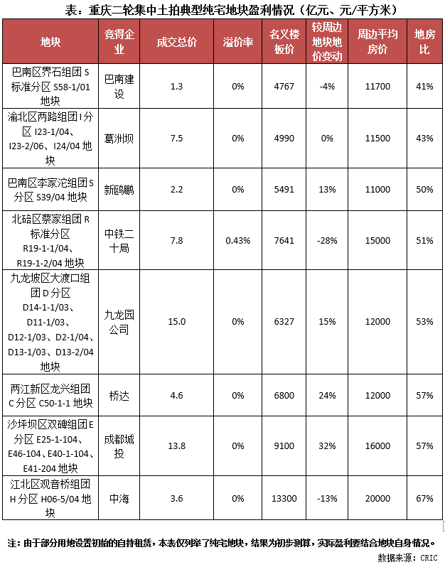 而就盈利情況來看,平均地房比為0.52(不考慮含自持租賃的地塊,下同),較首輪明顯提升,尤其是巴南、渝北的一些地塊,地房比低至0.4,典型如巴南區(qū)界石組團S標準分區(qū)S58-1/01地塊,樓面價僅有4767元/平方米,這一價格較萬科在周邊拿下的同類地塊樓板價要低4%(該地在首輪集中出讓,樓板價4975元/平方米),按照周邊在售項目平均銷售價11700元/平方米來測算,地房比低至0.41,房地差近7000元/平方米,盈利空間十分可觀。即使是本場土拍中唯一溢價成交的北碚區(qū)蔡家地塊(樓板價7641元/平方米),按照周邊在售均價15000元/平方米來測算的話,地房比也僅有51%,也能保持良好的盈利。