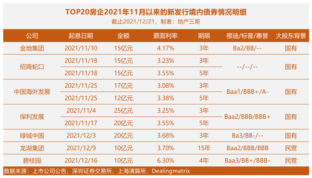 進入11月份之后,TOP20房企中發(fā)行中期票據(jù)(公司債券)的房企有金地、招商蛇口、中海、保利、綠城和龍湖、碧桂園。