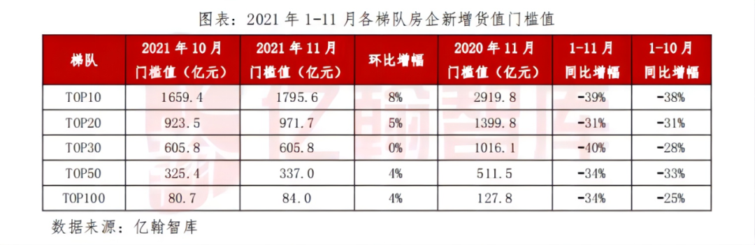 受其影響,為了續(xù)命、保命,房地產(chǎn)企業(yè)無疑會減少投資現(xiàn)金流出,拿地異常謹(jǐn)慎。進入2021年下半年,頭部房地產(chǎn)企業(yè)防御性拿地、甚至不再拿地。2021年1-11月統(tǒng)計數(shù)據(jù)來看,頭部房企新增貨值平均降低了30%-40%。