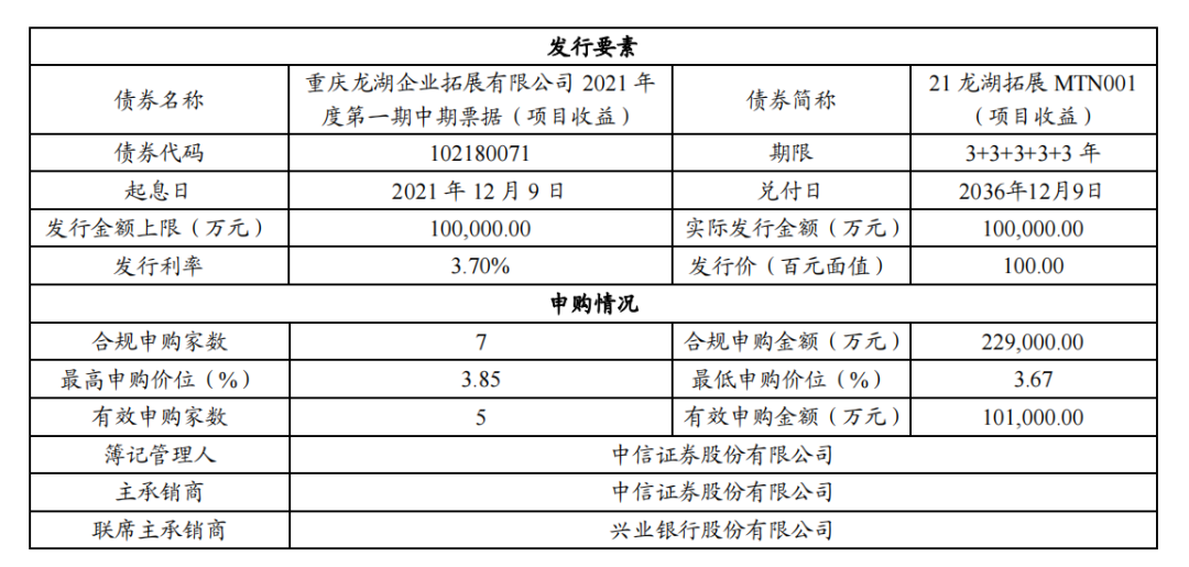 在此之前的12月10日,龍湖控股集團有限公司發(fā)布公告,公司間接附屬公司重慶龍湖企業(yè)拓展有限公司已于2021年12月7日及8日公開發(fā)行2021年度第一期中期票據(jù),規(guī)模為人民幣10億元。期限15年,票面利率3.70%。