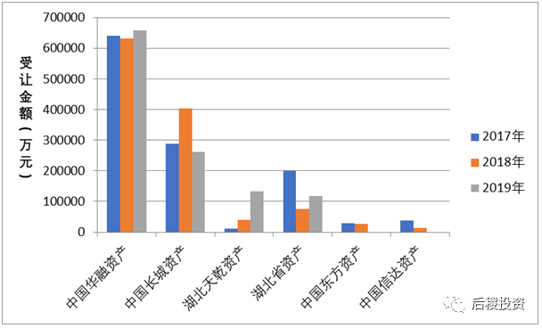 與去年相同,華融資產、長城資產兩家收購量依舊搶眼,作為一級市場主要持牌AMC受讓方占據接近80%的市場份額。而成立于2016年底的湖北天乾資產后來居上,受讓金額逐年攀高。