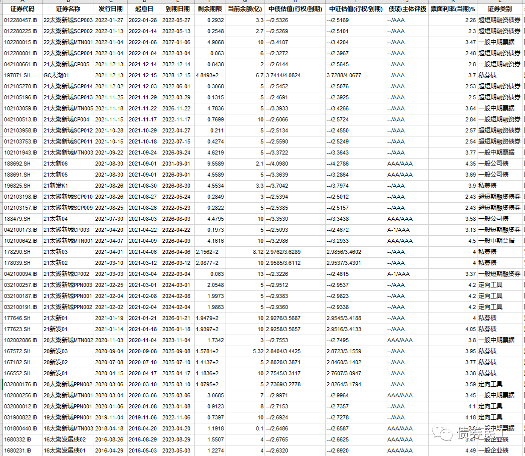 太湖新城最新的主體信用等級為AAA(上海新世紀(jì)、大公國際和聯(lián)合資信)。太湖新城目前存量債券金額為242.64億元,存量債券只數(shù)為40只,債券品種包括企業(yè)債券、公司債券和債務(wù)融資工具等。