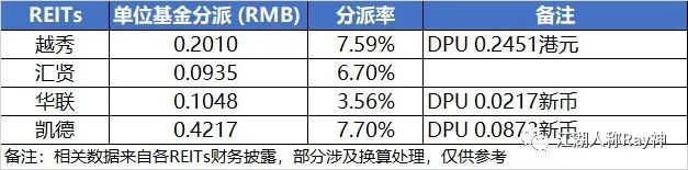當然,蛇口產園的派息是發生在9月底,并非是按照全年的可分配金額(FAD)進行了分派。但即便我們按照年報中給出的全年FAD來計算,分派率也只能達到3.36%(按90%的分紅比例計算),這依然是不及招股說明書中預測的4.10%。而相較于去年同期境外REITs的分派率表現來看,這一數值也是有所不及的。