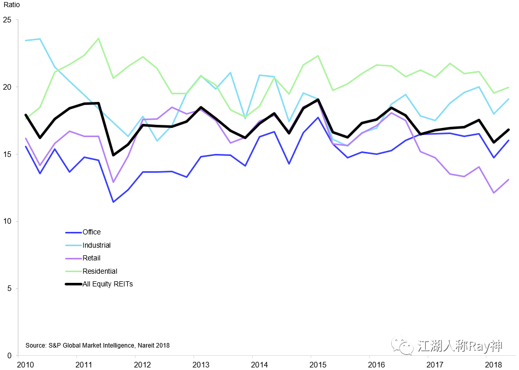 有些人也許會想:市凈率高既然是股價漲了,有什么不好呢?這個問題,我們可以通過P/FFO這個指標來理解。FFO是指經營產生的現金流(Fund from Operation),P/FFO=股價(P)/經營現金流(FFO),也就是股價相對于經營現金流的倍數。由于經營性不動產的資產價值往往是由經營產生的現金流所決定的,故而在REITs發行過程中,經常會通過P/FFO進行估價。所以,作為估價因子的P/FFO,與資本化率一樣針對于特定的資產類型是有相對合理的水平的。境外商業/辦公REITs的P/FFO大多在10-18之間,比如:凱德的P/FFO在15左右,招商蛇口在香港的REITs則是在10左右的樣子。