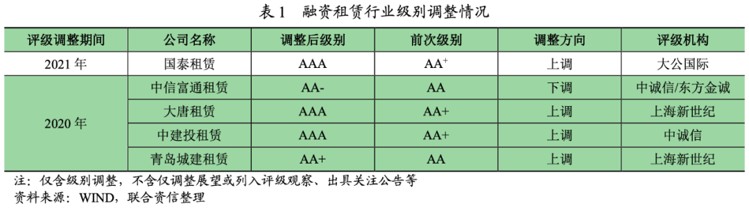 2021年以來,依據(jù)公開可查資料,新增1家融資租賃公司(以下分析均不包含金融租賃公司)發(fā)生信用等級(jí)遷移,即國(guó)泰租賃評(píng)級(jí)發(fā)生上調(diào),無新增有公布的評(píng)級(jí)下調(diào)的融資租賃公司。
