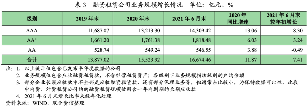 2021年以來,受疫情反復(fù)的影響,為了保持市場(chǎng)穩(wěn)定,資本市場(chǎng)資金面整體較為寬裕。從樣本公司經(jīng)營(yíng)情況來看,2021年上半年,AAA級(jí)別[4]融資租賃公司業(yè)務(wù)規(guī)模較年初增長(zhǎng)較快,主要系部分資質(zhì)較好的企業(yè)負(fù)債端再融資壓力相對(duì)較小,因此其在資產(chǎn)端能夠持續(xù)擴(kuò)大投放規(guī)模所致;AA+、AA級(jí)別融資租賃公司業(yè)務(wù)規(guī)模增速顯著低于AAA級(jí)別融資租賃公司,主要系行業(yè)內(nèi)部競(jìng)爭(zhēng)加劇,實(shí)力偏弱的融資租賃公司面臨更大的壓力,需要注意的是,AA級(jí)別融資租賃公司業(yè)務(wù)規(guī)模較年初已經(jīng)出現(xiàn)小幅下滑的情況,未來需要對(duì)低評(píng)級(jí)公司的業(yè)務(wù)發(fā)展趨勢(shì)保持關(guān)注。另外,樣本內(nèi)能夠獲取到完整數(shù)據(jù)的融資租賃公司以中高級(jí)別居多,該部分企業(yè)通常資質(zhì)較好,受到外部融資環(huán)境結(jié)構(gòu)性緊張的影響相對(duì)較小,因此本文中樣本統(tǒng)計(jì)數(shù)據(jù)會(huì)與行業(yè)實(shí)際平均水平有一定的偏差。