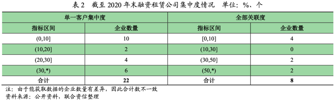 據(jù)了解,許多融資租賃公司尚未確定明確的轉(zhuǎn)型方案,尤其是對(duì)于關(guān)聯(lián)集中度超過50%的融資租賃公司。雖然融資租賃公司可能選擇采用與其他企業(yè)交換資產(chǎn)的方式來降低集中度,但未來能否順利施行仍有待觀察。部分融資租賃公司已經(jīng)開始拓展集團(tuán)外的業(yè)務(wù),由于租賃周期通常在3年以上并且對(duì)集團(tuán)外部業(yè)務(wù)的風(fēng)險(xiǎn)把控能力有待檢驗(yàn),因此短期內(nèi)集中暴露風(fēng)險(xiǎn)的可能性不大,但在未來的一個(gè)租賃周期及經(jīng)濟(jì)周期內(nèi)仍可能會(huì)出現(xiàn)資產(chǎn)質(zhì)量下降的情況。截至2020年末,公開并且能獲取到客戶集中度數(shù)據(jù)的融資租賃公司中單一客戶集中度超過30%的有6家;全部關(guān)聯(lián)度超過50%的有2家。