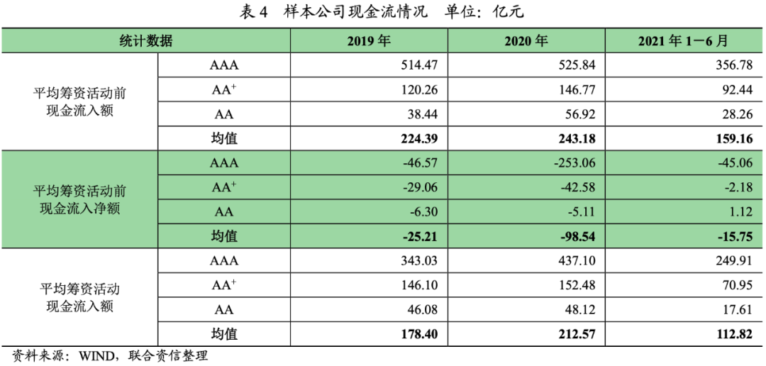 從業(yè)務(wù)內(nèi)生現(xiàn)金流來看,2020年,樣本公司平均籌資活動(dòng)前現(xiàn)金流入額實(shí)現(xiàn)同比增長(zhǎng)。分結(jié)構(gòu)來看,AAA、AA+和AA級(jí)別的樣本公司平均籌資活動(dòng)前現(xiàn)金流入額均實(shí)現(xiàn)了同比增長(zhǎng)。2021年上半年,樣本公司平均籌資活動(dòng)前現(xiàn)金流入額較為平穩(wěn),表明樣本公司正常經(jīng)營(yíng)產(chǎn)生的現(xiàn)金回流處于較為平穩(wěn)的狀態(tài)。