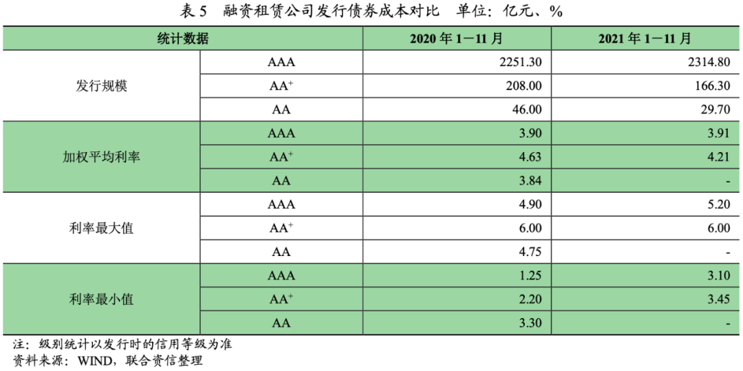 2021年,AA+級(jí)別融資租賃公司發(fā)行債券和資產(chǎn)證券化產(chǎn)品成本均較上年同期下降,與AAA級(jí)別利差較上年同期有所收縮;融資租賃公司股東背景和股東支持的認(rèn)可度對(duì)其債券發(fā)行成本有較大的影響,融資租賃公司融資端分化情況仍然存在。