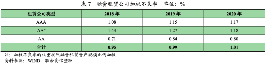 整體看,受近年來宏觀經(jīng)濟(jì)下行,信用風(fēng)險(xiǎn)事件頻發(fā)影響,融資租賃公司不良率總體呈上升趨勢(shì),資產(chǎn)質(zhì)量承壓,但部分風(fēng)控能力較強(qiáng)或主要開展產(chǎn)業(yè)集團(tuán)內(nèi)業(yè)務(wù)的融資租賃公司資產(chǎn)質(zhì)量仍能得到保障,不良率分化趨勢(shì)較顯著。在有披露2021年6月末不良率的17家樣本公司中,有5家樣本公司的2021年6月末的不良率較2020年末有所提高。