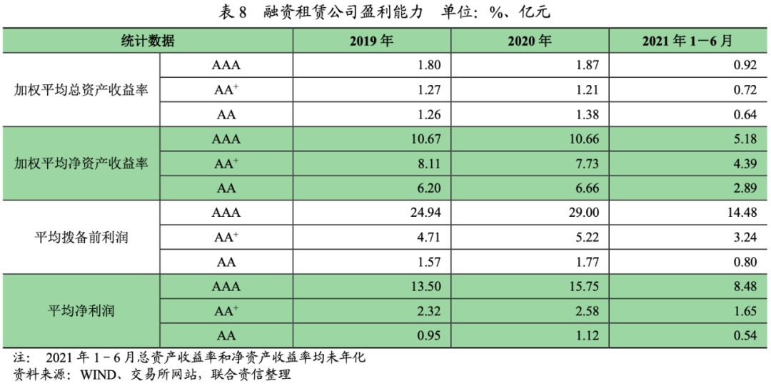 從利潤(rùn)規(guī)模來看,2020年,AAA、AA+和AA級(jí)別融資租賃公司的平均撥備前利潤(rùn)同比增長(zhǎng)16.29%、10.74%和12.46%。2020年,AAA、AA+和AA級(jí)別融資租賃公司的平均凈利潤(rùn)同比增長(zhǎng)16.71%、10.85%和17.50%,AA級(jí)別融資租賃公司平均凈利潤(rùn)增速最快,增速超過AAA級(jí)別融資租賃公司,其中AA級(jí)別融資租賃公司計(jì)提的減值準(zhǔn)備比例較低是原因之一。2021年上半年,AAA、AA+和AA級(jí)別融資租賃公司的平均凈利潤(rùn)同比增長(zhǎng)28.51%、33.08%和4.14%,各級(jí)別融資租賃公司凈利潤(rùn)均實(shí)現(xiàn)增長(zhǎng),但是增速分化明顯。