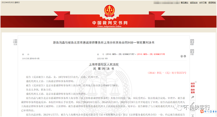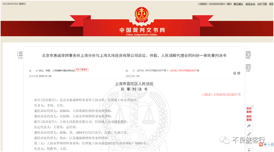 惠誠上海分所與委托人律師費糾紛