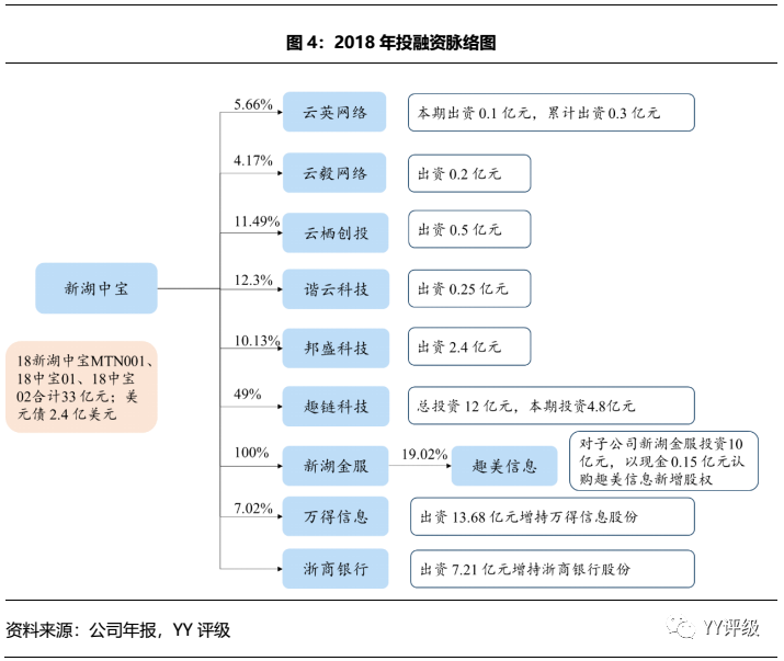 2018年,公司融資端有息債務增加33億元,包括當年新發行的18新湖中寶MTN001、18中寶01、18中寶02合計33 億元。帶來的資產端變化包括:(1)其他應收款增加99億元,其中包括當年新增的與新湖控股的往來款25億元和與浙江允升投資的往來款12億元;(2)可供出售金融資產減少7億,主要是萬得信息本期轉入長期股權投資核算;(3)長期股權投資增加10億元,其中包括對子公司新湖金服投資10億元。另外,公司本期還發行了2.4億美元(人民幣16億元)的境外債,未包含在母公司個別報表中。