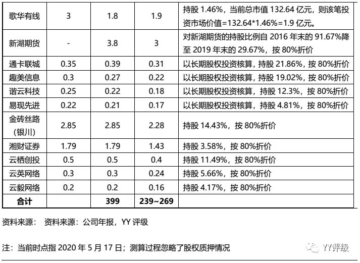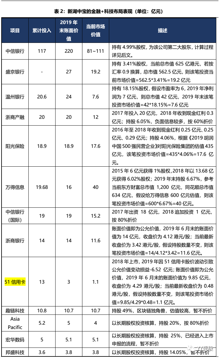 根據新湖中寶2019年年報披露,新湖中寶持有中信銀行H股24.46億股,根據當前股價3.67港元、匯率0.9計算得到該筆投資的市場價值為81億元;若按照持股比例4.99%,總市值2,232億元計算得到該筆投資的市場價值為111億元。兩次計算結果差別較大主要是由A股和H股存在價格差異導致。