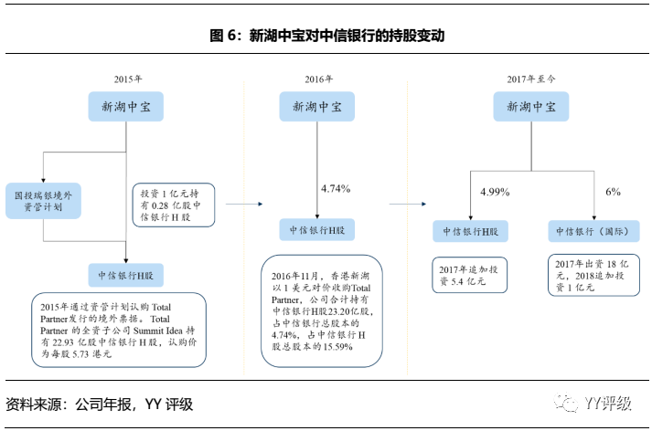 隨后在2016年11月,香港新湖以1美元對價收購TotalPartner,實現對中信銀行H股的持有,共計23.20億股,占中信銀行總股本的4.74%,占中信銀行H股總股本的15.59%,并派遣董事進入中信銀行董事會。由此,新湖中寶將該投資從可供出售金融資產轉出至長期股權投資進行核算。2017年新湖中寶又對該部分投資追加5.4億元,累計總投資117億元(22.93*5.73*0.84+1+5.4)。